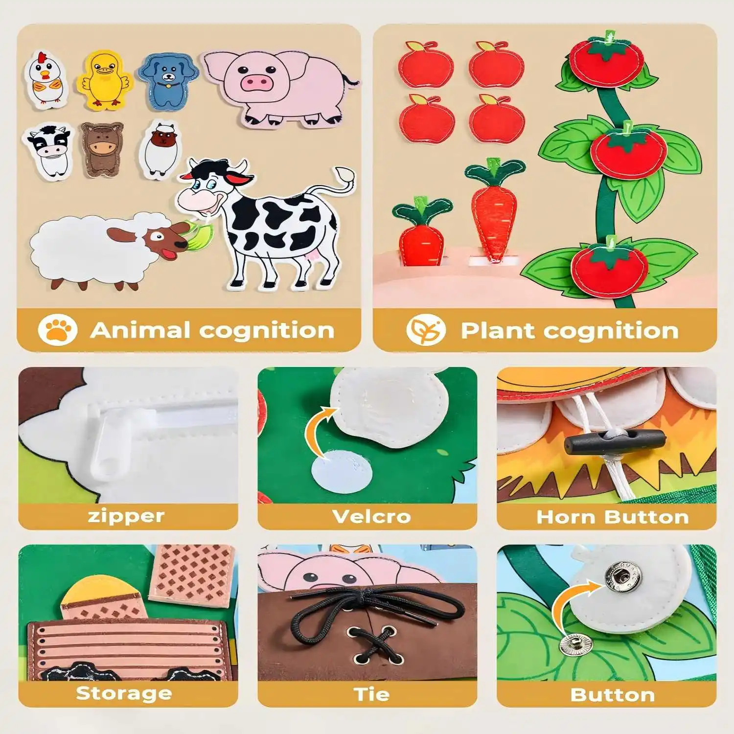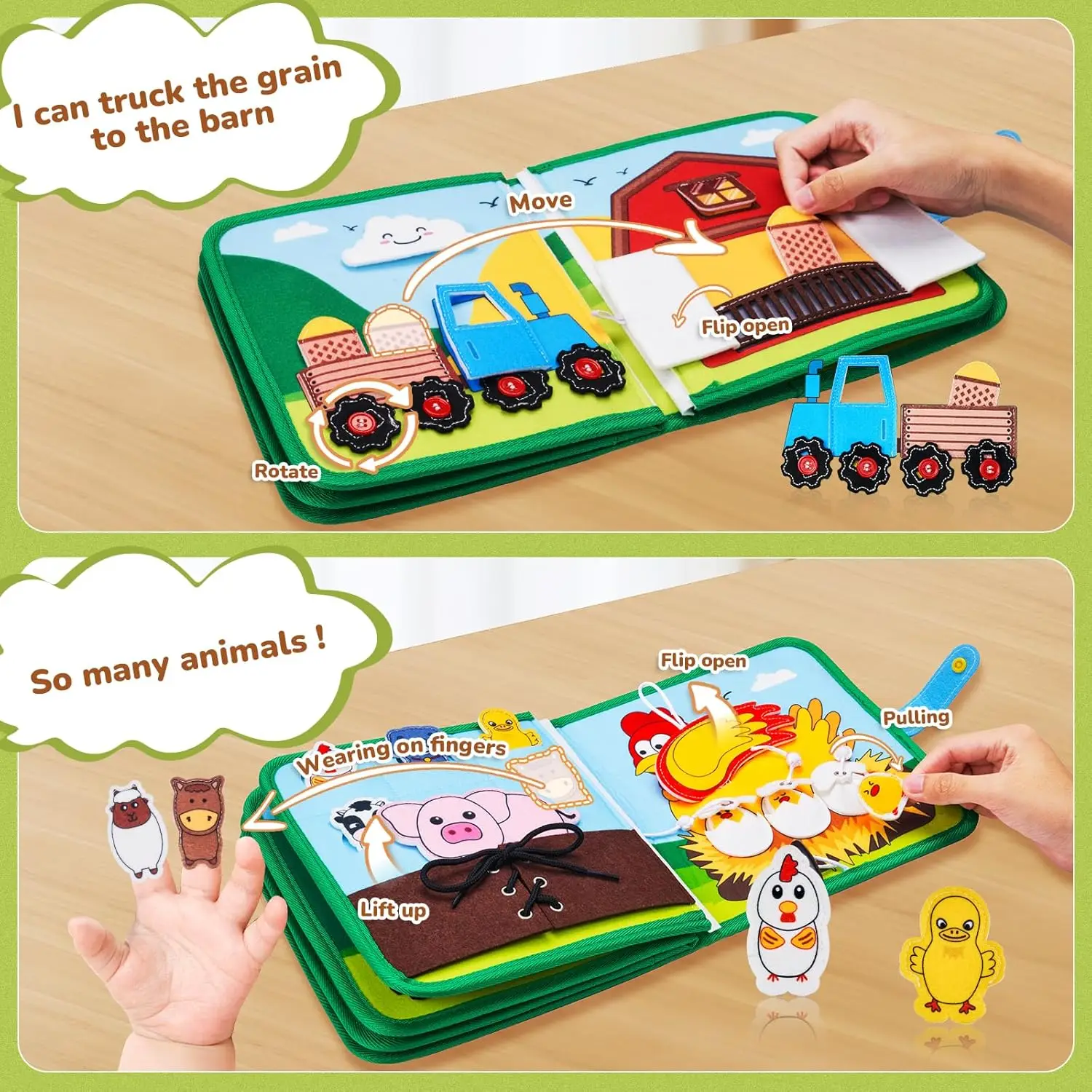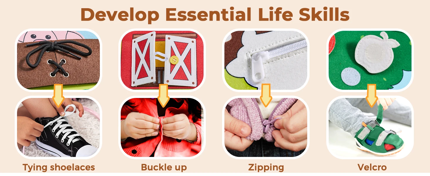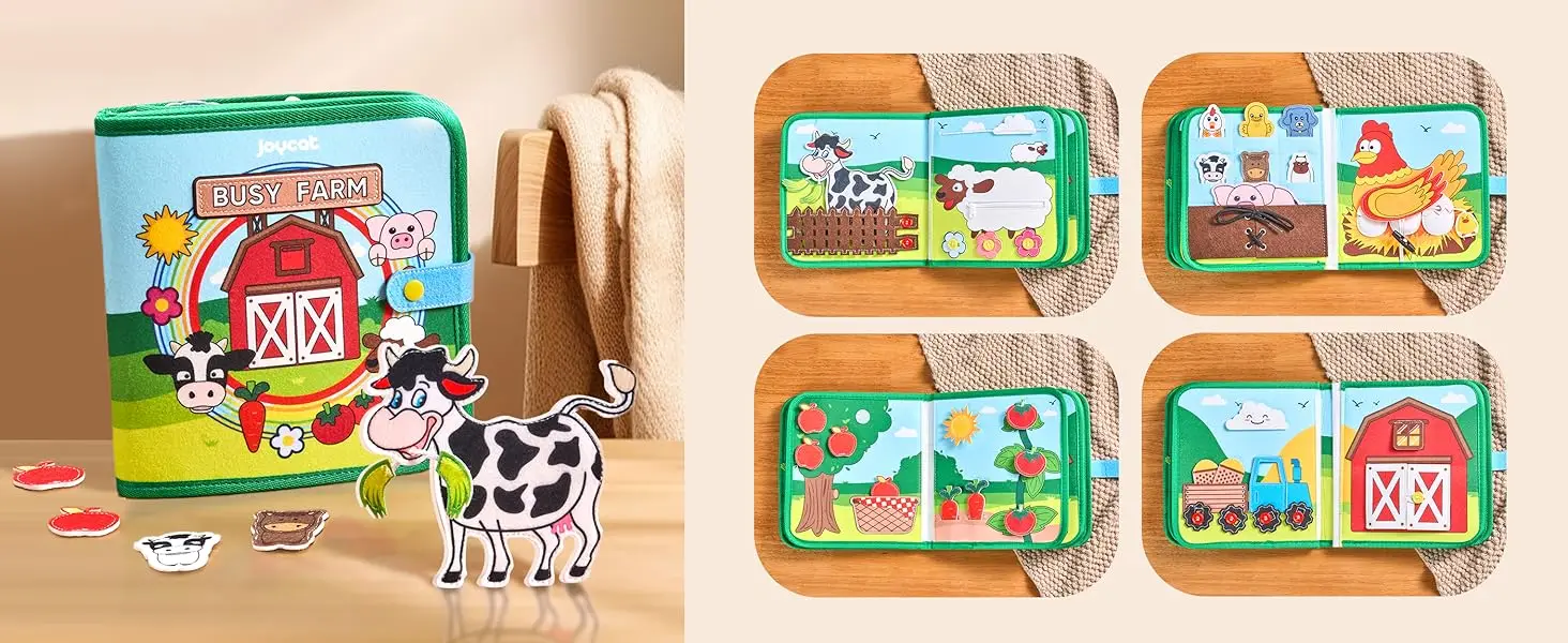 Farm Themed Story Book: Farm themed busy board is unlike any other, not only learning fine motor skills, but also recognizing animals and plants and learning about farm life. This quiet book for toddlers shows children farm scenes such as feeding cows, dress up a sheep,picking apples and tomatoes, pulling out radishes ,crops being picked, tractors carrying grain, grain being put in the barn, animal gathering (Doll Game) and hens laying eggs. Keeps toddlers focused and encourages them to play alone or together. This is a very quiet toy that brings comfort to parents.